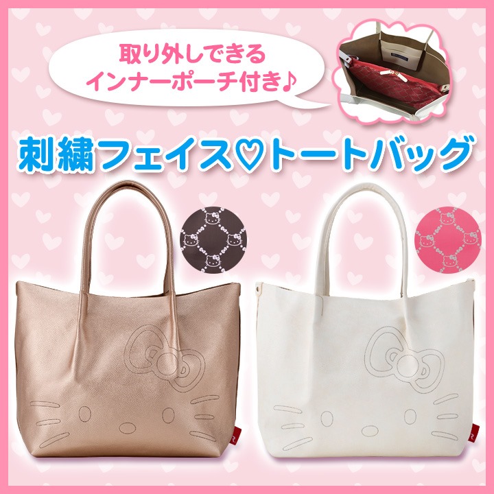 カラーはアイボリーを始めいろんなカラーを揃えたよ。ぱっと見がキティキティしていないのもいい。大人かわいいこのトートバッグであなたもお出かけしてみてはいかが?