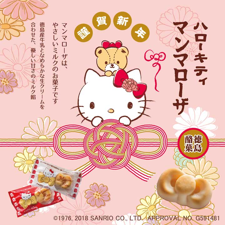 徳島を代表するミルクのお菓子マンマローザとハローキティがコラボしたお正月バージョンが新登場!