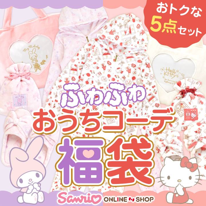 サンリオショップで販売される福袋を、サンリオオンラインショップでも一部特別販売するよ♪ かわいいふわもこバッグに、パーカー、ルームシューズなどが入ったおトクな5点セット!