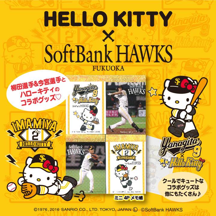フルスイングした「柳田キティ」や、華麗な守備の「今宮キティ」が発売!! メモ帳セット、タオル、ツインメガホン、トートバッグなどクールでキュートなコラボグッズがいっぱいだよ♪